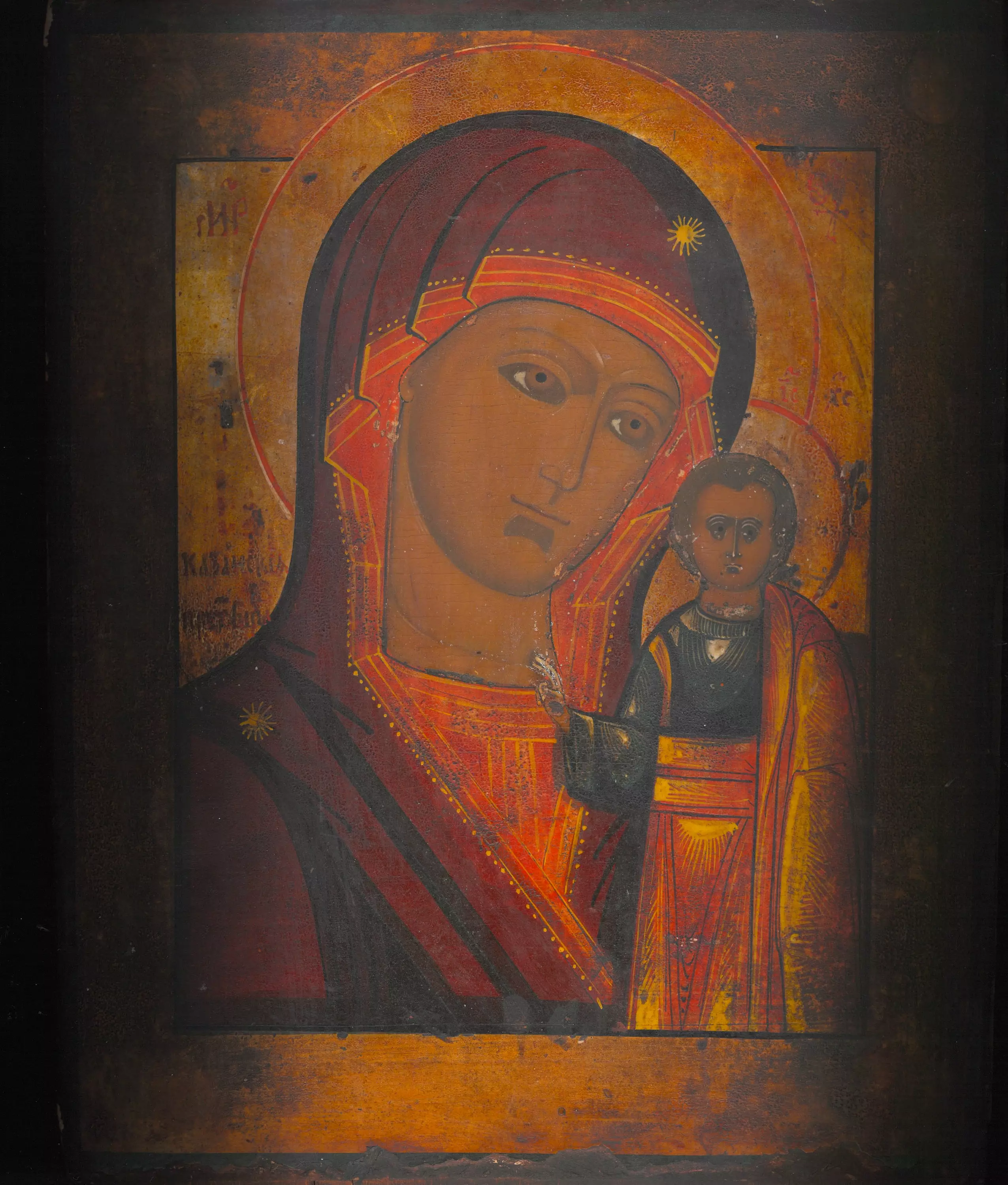 Antiikki Kazanin Jumalanäiti 1800-luvulta. Mitat 27x31x2cm. Ainutlaatuista Kazanin Jumalanäidin ikonille on, että ikonin Jeesus-lapsi seisoo.