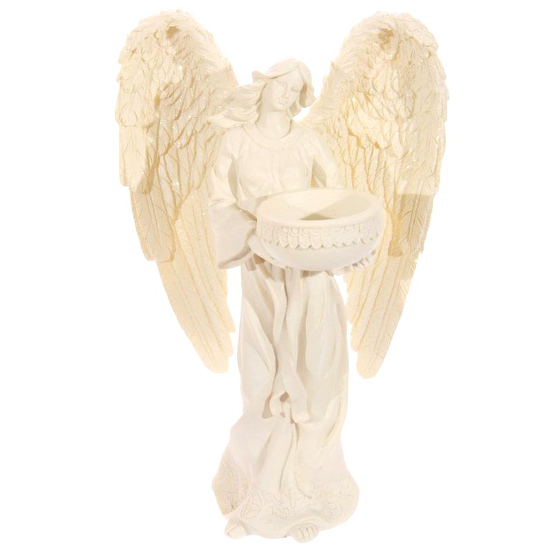 Kaunis enkelituikku-alunen, jossa huolellisesti viimeistelty enkeli pitelee käsissään tuikkualusta.