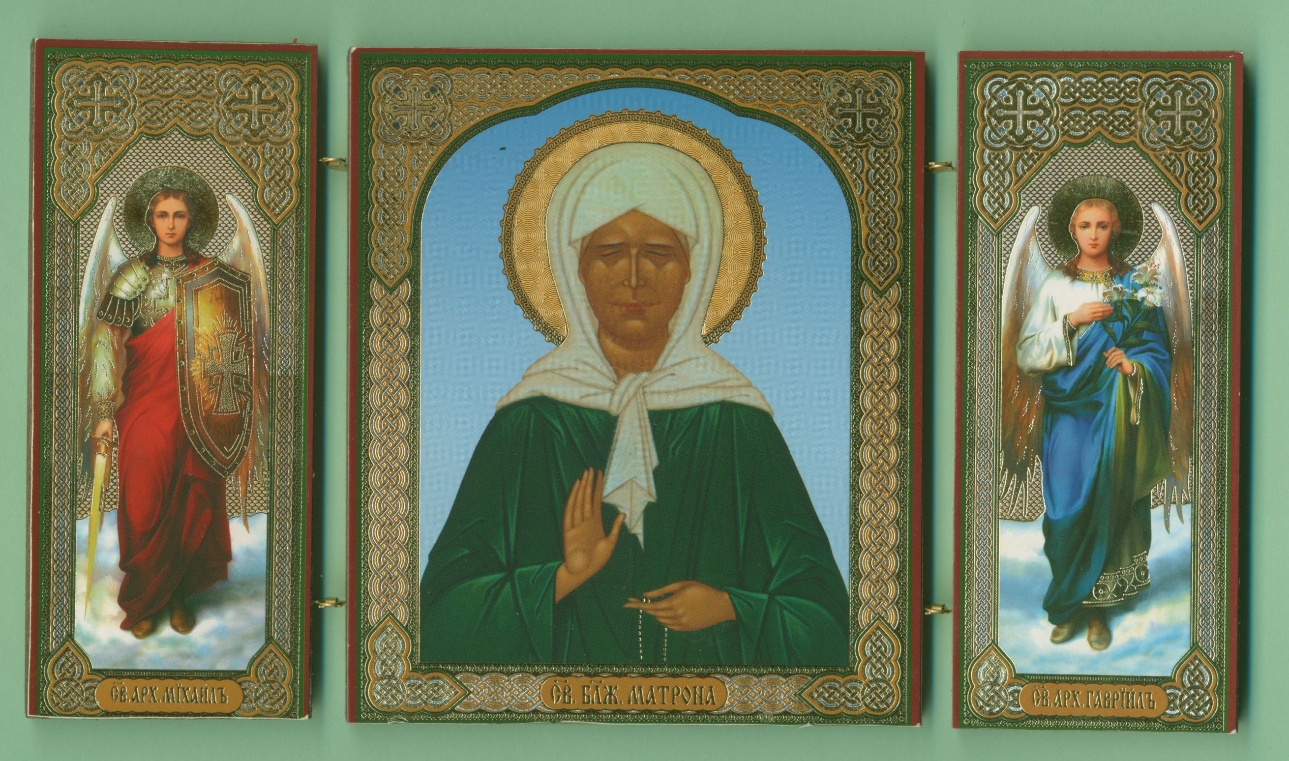 Kolmiosainen matka- ja pöytäikoni, Matrona Moskovalainen sekä arkkienkelit Mikael ja Gabriel.