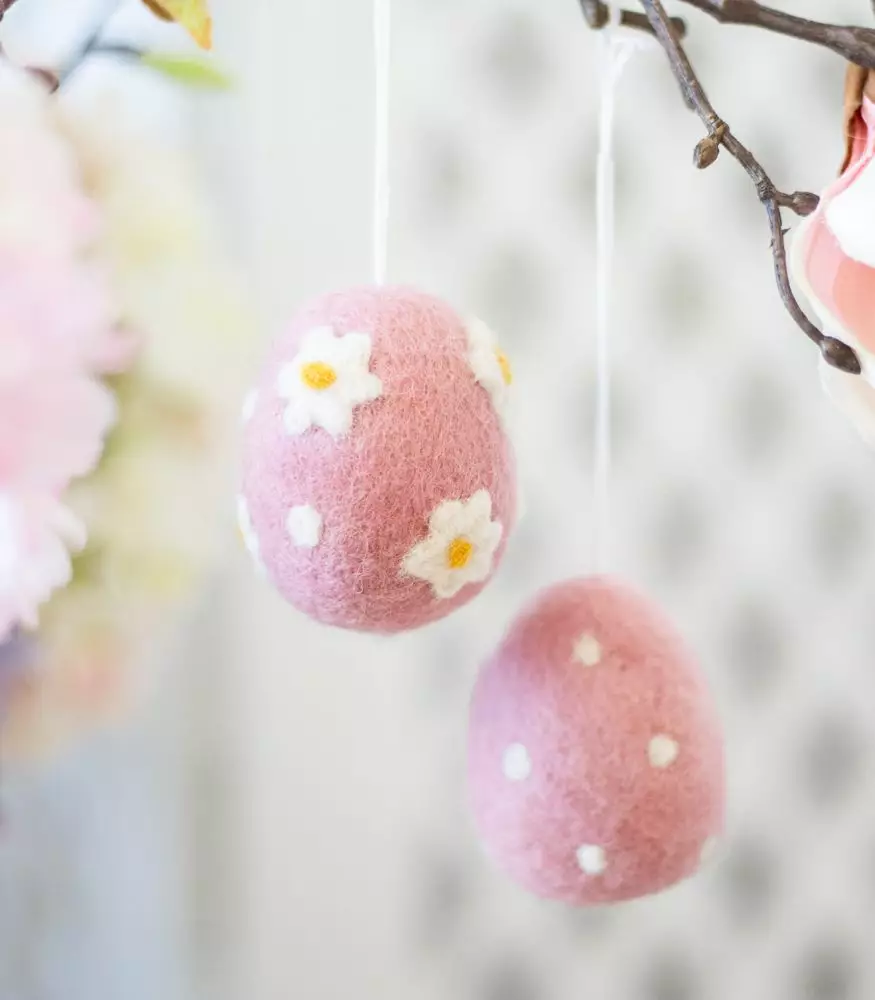 100% lampaanvillasta huovutettu päivänkakkara koristeinen pääsiäismuna. Väri: vaaleanpunainen/valkoinen. Koko 6x4,5x4,5cm