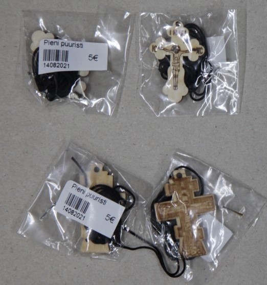 Ristit ovat puupohjaisia ja niissä on naru kaulan ympäri, ei ketjua. Risteissäa näissä on slaavinkielistä tekstiä joko etu- tai taustapuolella. Tekstinä on ”Pelasta ja varjele Herra” (спаси и сохрани).