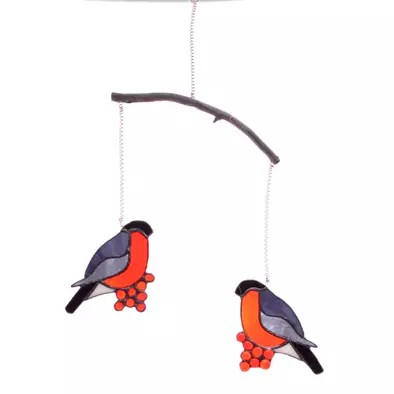 Punatulkkupari kelo-oksassa. Punatulkut on tehty Tiffany-tekniikalla. Lasi on läpivärjättyä lasia, joten värit säilyvät vuodesta toiseen.