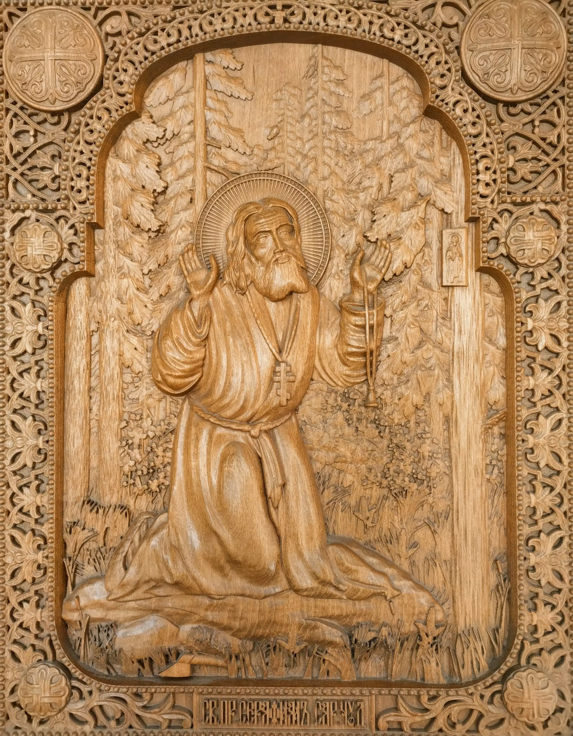 Puinen kaiverrettu Pyhittäjä Serafim Sarovilaisen ikoni (+ 1833, muistamme 19. päivänä heinäkuuta).