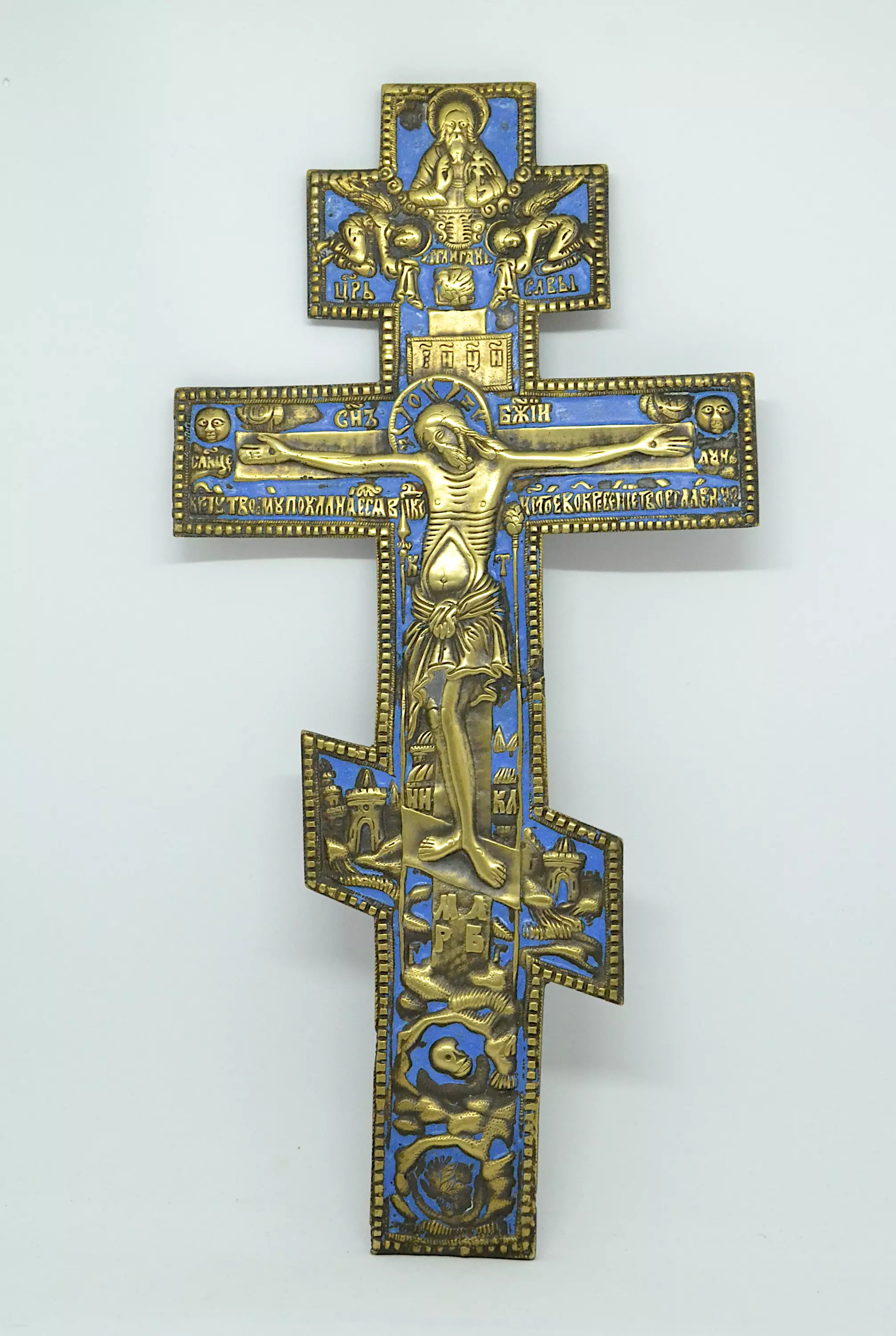Emalikoristeinen metalliristi. Korkeus 35,5 cm, leveys 17,8 cm. Paino 0,77 kg.