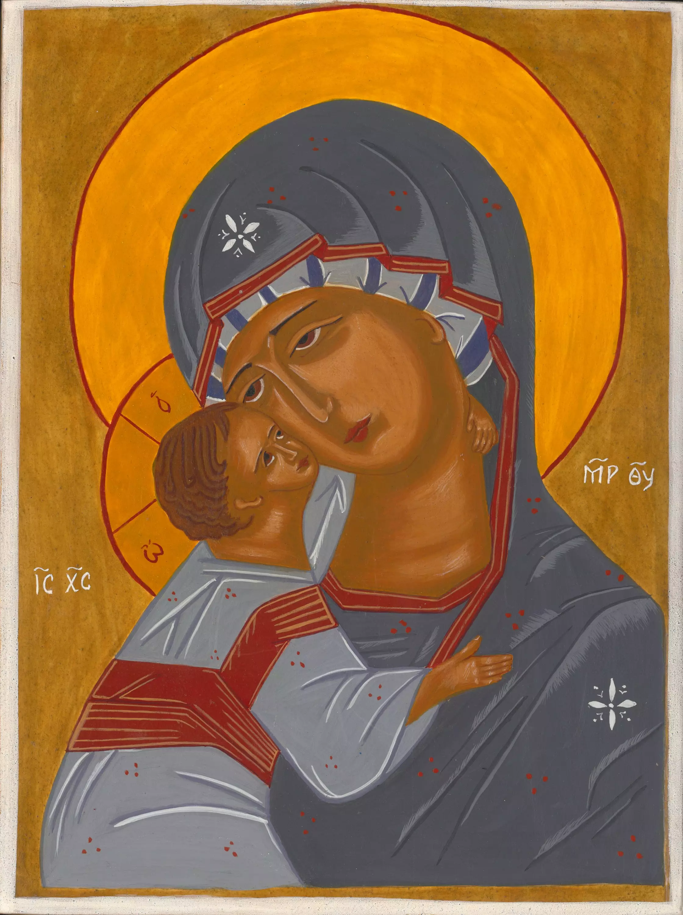 Pyhä kärsimyksenkantaja, Kiovan suurruhtinas Igor Tšernigovilainen (+ 19. syyskuuta 1147) rukoili Jumalanäidin ikonin edessä viimeisinä elonhetkinään Kiovan luolaluostarissa sijainneessa Pyhän Johannes Teologin kappelissa. Ikoni kuuluu Venäjällä suosittuun Eleusa (Hellyyden jumalanäiti) -ikonityyppiin, jossa Kristus-lapsi on poski poskea vasten Neitsyt Marian kanssa, asento kuvastaa heidän välistään lämmintä suhdetta. Ikonityypistä huokuu myös Jumalanäidin syvä suru Kristuksen tulevista kärsimyksistä.